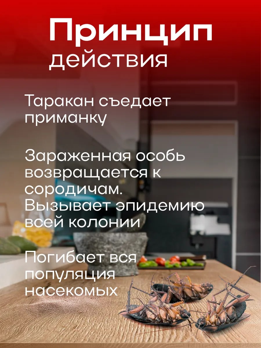 Насекомые погибают не сразу, а в течение 2-3 суток, распространяясь по помещению и гнездам. Следующее поколение тараканов погибает, поедая фекалии и трупы своих сородичей, что происходит в течение 5-6 дней. Таким образом, полное уничтожение тараканов достигается через 3-4 поколения, примерно за 15-25 дней.